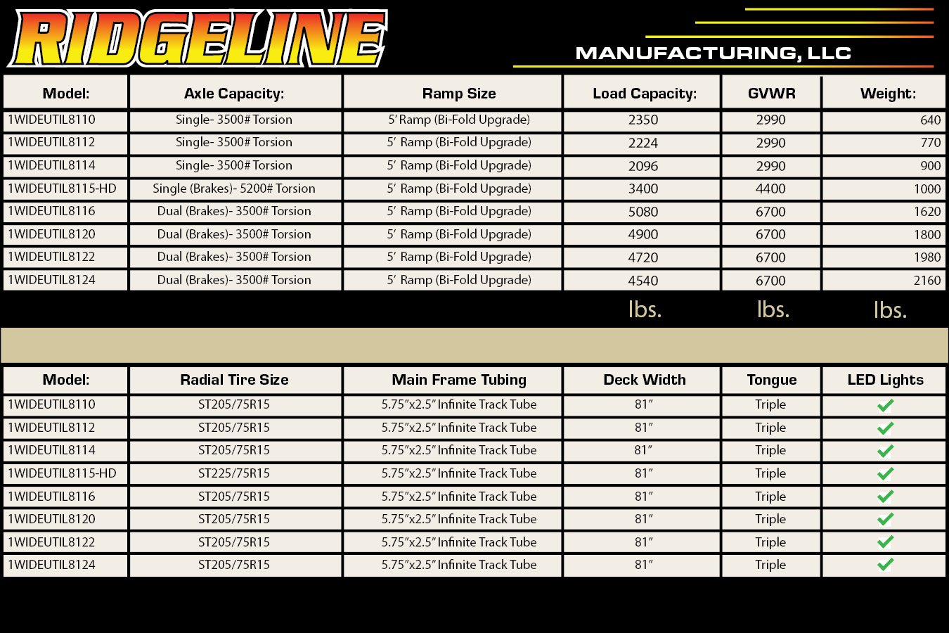 The Ridgeline Infinite Track Utility is an aluminum frame, light, and durable trailer backed by a 5-year structural warranty and is built with the standard features you need. Some to point out are the triple a-frame tongue design, 15″ radial rim & tire, & a beefy ramp that can handle the abuse. Standard lengths include 10′, 12′, 14′ and 15′ single axle,& up to 32′ triple axle units. Thanks for looking at RIDGELINE.